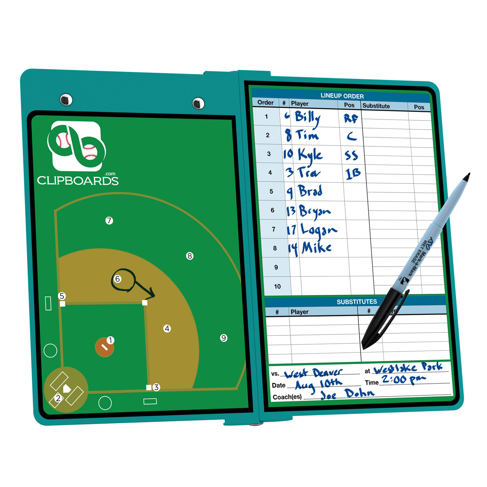 Need a clipboard that functions as a baseball field? Run all your team plays and have your lineup card ready on this folding clipboard without leaving any permanent marks. This clipboard is ideal for keeping stats on players, as well as setting up plays on full field layout. This is a one-of-a-kind patented folding clipboard made of lightweight aluminum designed for anyone needing a solid writing surface and the ability to hold documents by folding the clipboard in half. Designed to withstand daily use and abuse. Carry a full size 5 x 8-inch notepad inside this clipboard.